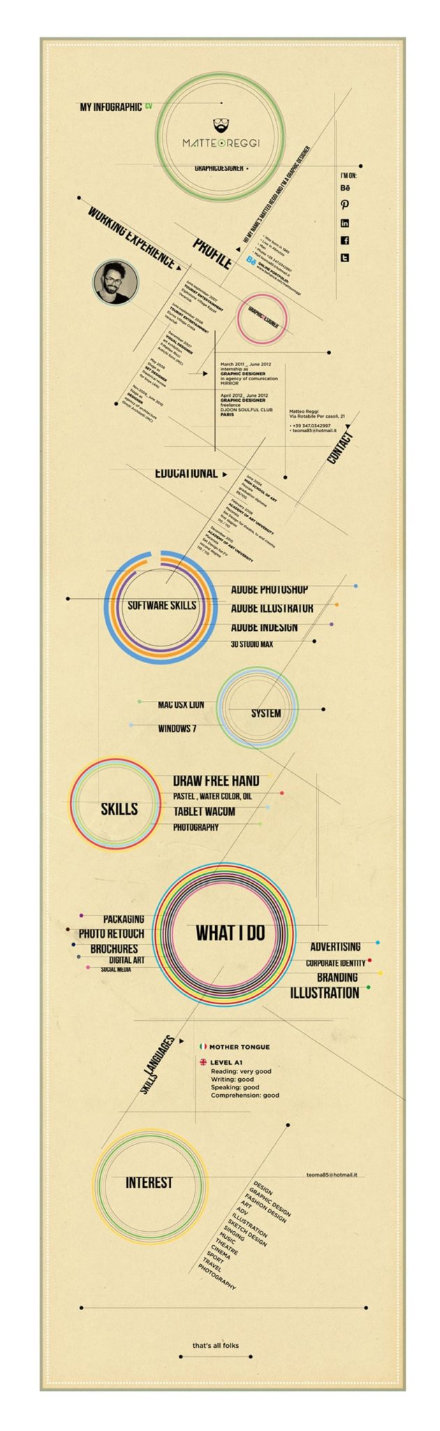 An unusual and ambitious design from London-based designer Matteo Reggi, this infographic-inspired resume surely deserves to be mounted on the wall!