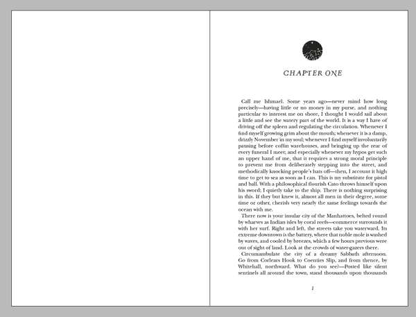 Upping the Tracking of type can make it instantly more legible, attractive and high-impact, without needing to increase the Font Size or adjust the Font Weight (e.g. to Bold or Black). Take a look at these two example chapter headings from the typesetting for an edition of Moby Dick. The lower example, with its increased Tracking, looks a bit more interesting, no?