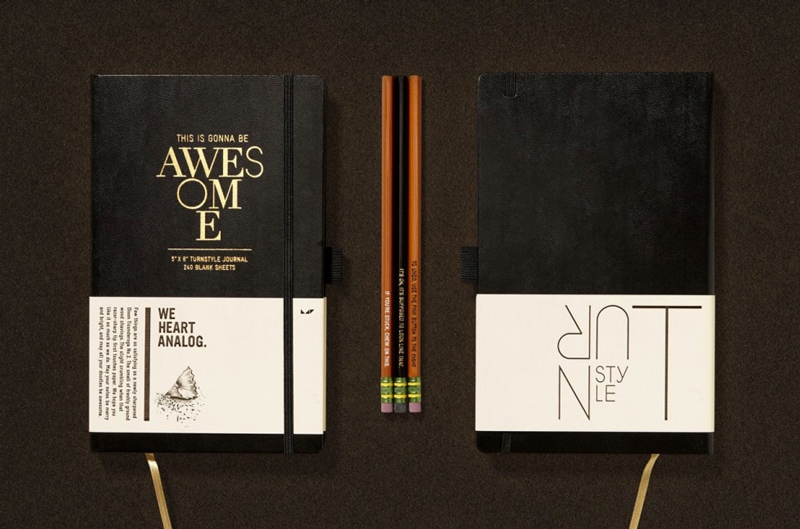Bringing the glamour back to corporate stationery, Seattle-based agency Turnstyle uses gold foil, elegant Art Deco-inspired type and geometric layouts on their own-brand business cards, letterheads, envelopes and journals.